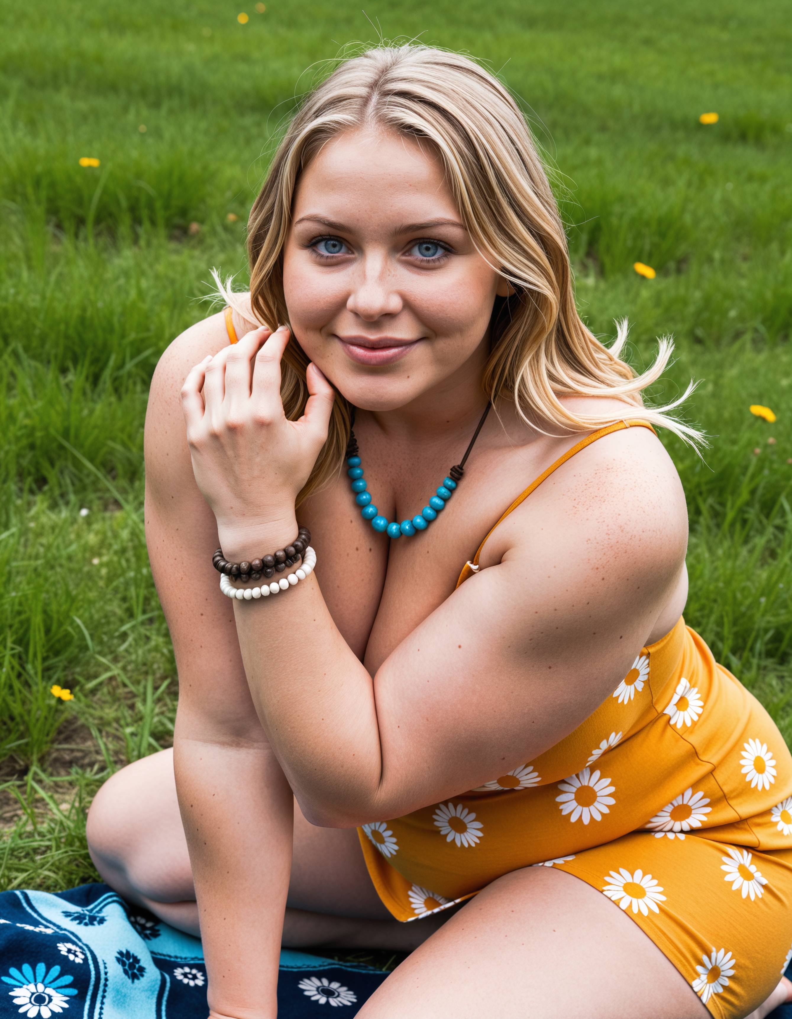 - beads, blonde hair, blue eyes, bracelet, breasts, cleavage, dress, floral print, freckles, grass, jewelry, large breasts, lips, long hair, looking at viewer, mole, mole on breast, mole under mouth, necklace, pearl necklace, realistic, sensitive, smile, solo, veiny breasts