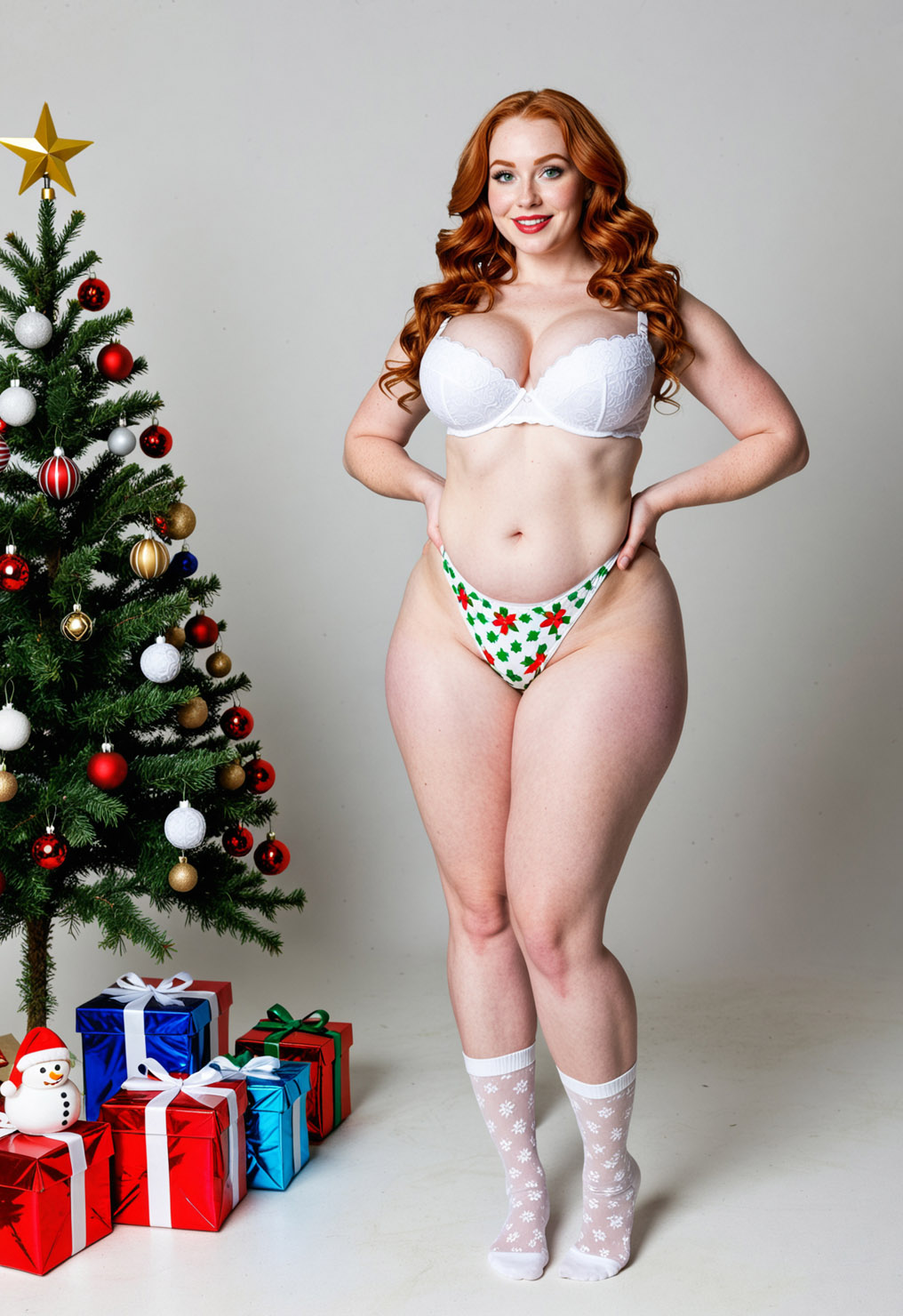 - box, bra, breasts, brown hair, christmas, christmas ornaments, christmas tree, cleavage, curly hair, full body, gift, gift box, green eyes, hands on hips, large breasts, lingerie, lips, long hair, looking at viewer, navel, panties, parted lips, plump, smile, socks, solo, standing, thick thighs, thighs, underwear, underwear only, white bra, white panties, white socks