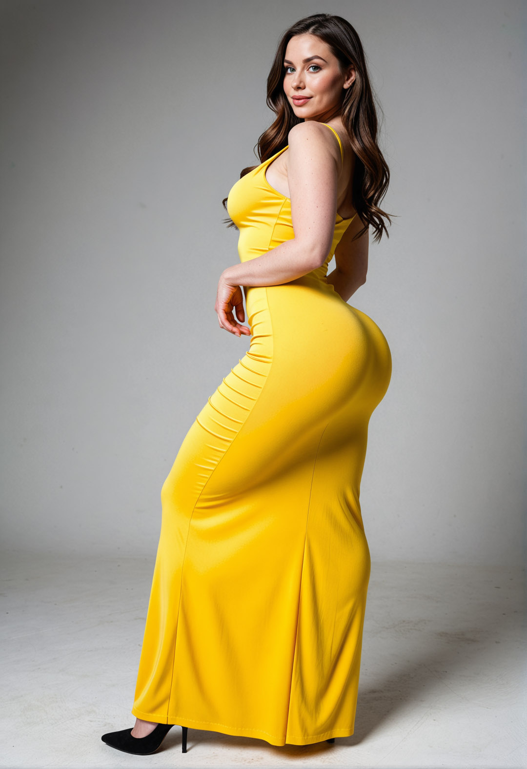 - ass, blue eyes, breasts, brown hair, dress, full body, high heels, lips, long dress, long hair, looking at viewer, realistic, solo, yellow dress