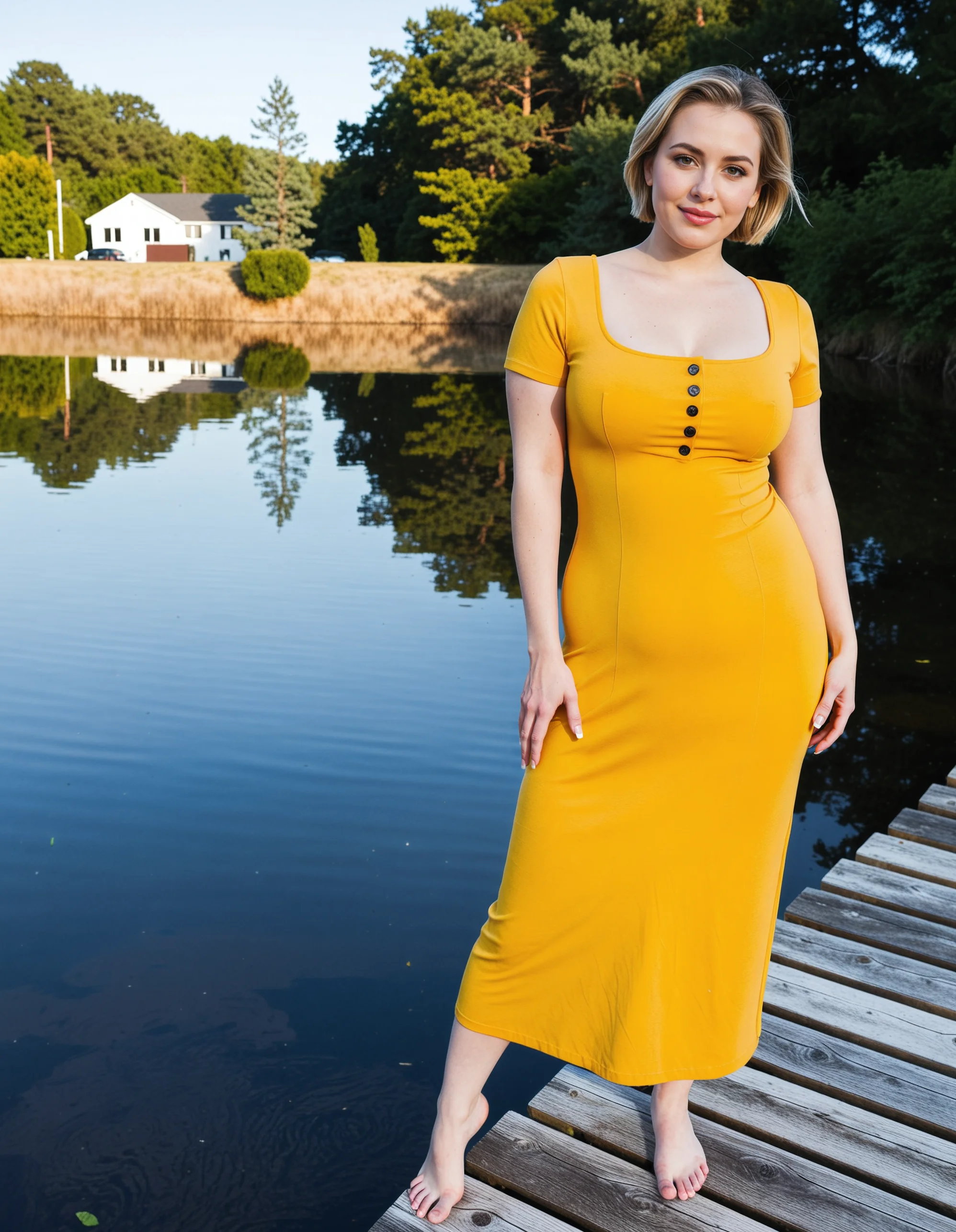- barefoot, breasts, brown hair, dress, full body, looking at viewer, outdoors, realistic, short hair, smile, solo, standing, tree, water, yellow dress