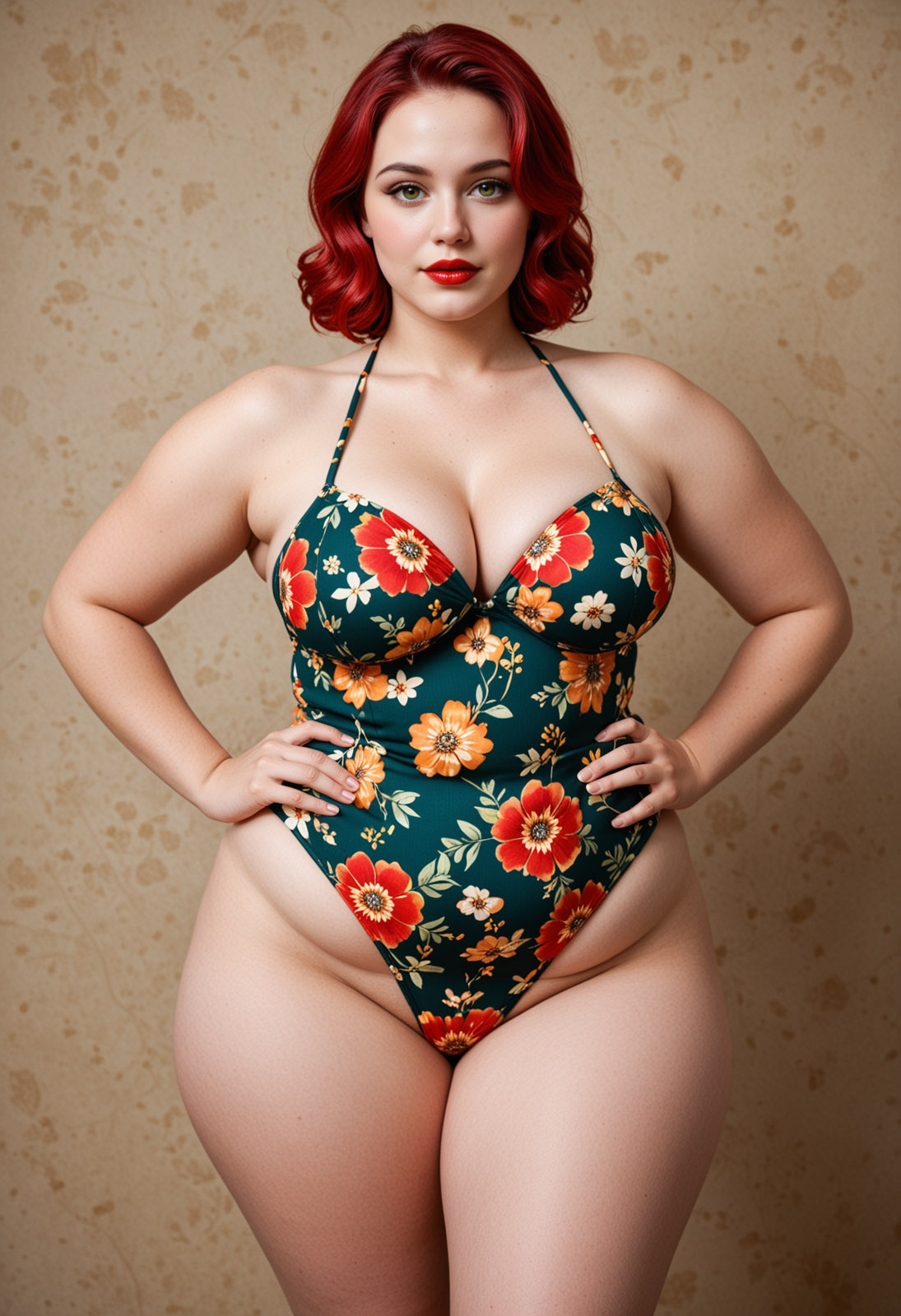 The image is a portrait of a young woman with red hair. She is standing in front of a beige background with a floral pattern. The woman is wearing a one-piece swimsuit with a halter neckline and thin straps. The swimsuit is green with orange and red flowers all over it. She has her hands on her hips and is looking directly at the camera with a confident expression. Her hair is styled in loose waves and she is wearing red lipstick. The overall mood of the image is glamorous and sensual.