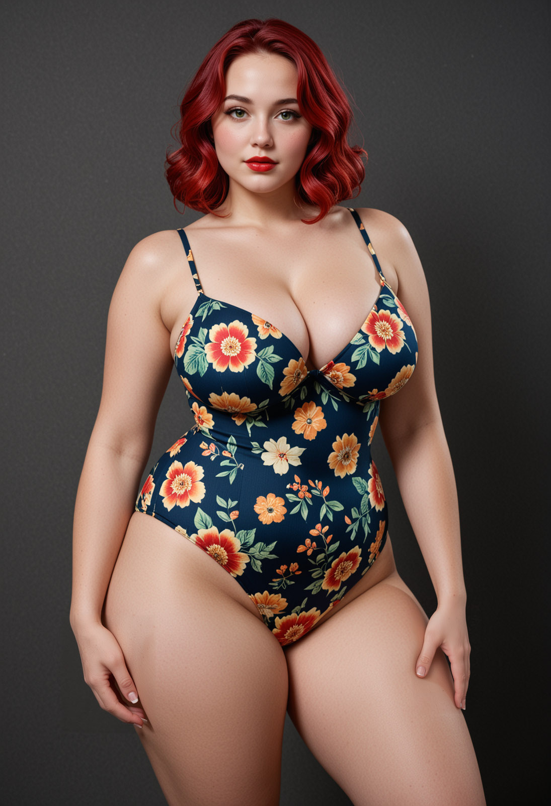The image is a portrait of a young woman with red hair. She is standing in front of a dark grey background and is posing with one hand on her hip and the other resting on her thigh. The woman is wearing a one-piece swimsuit with a floral print in shades of blue, orange, and yellow. The swimsuit has thin straps and a plunging neckline. She has a confident expression on her face and is looking directly at the camera.
