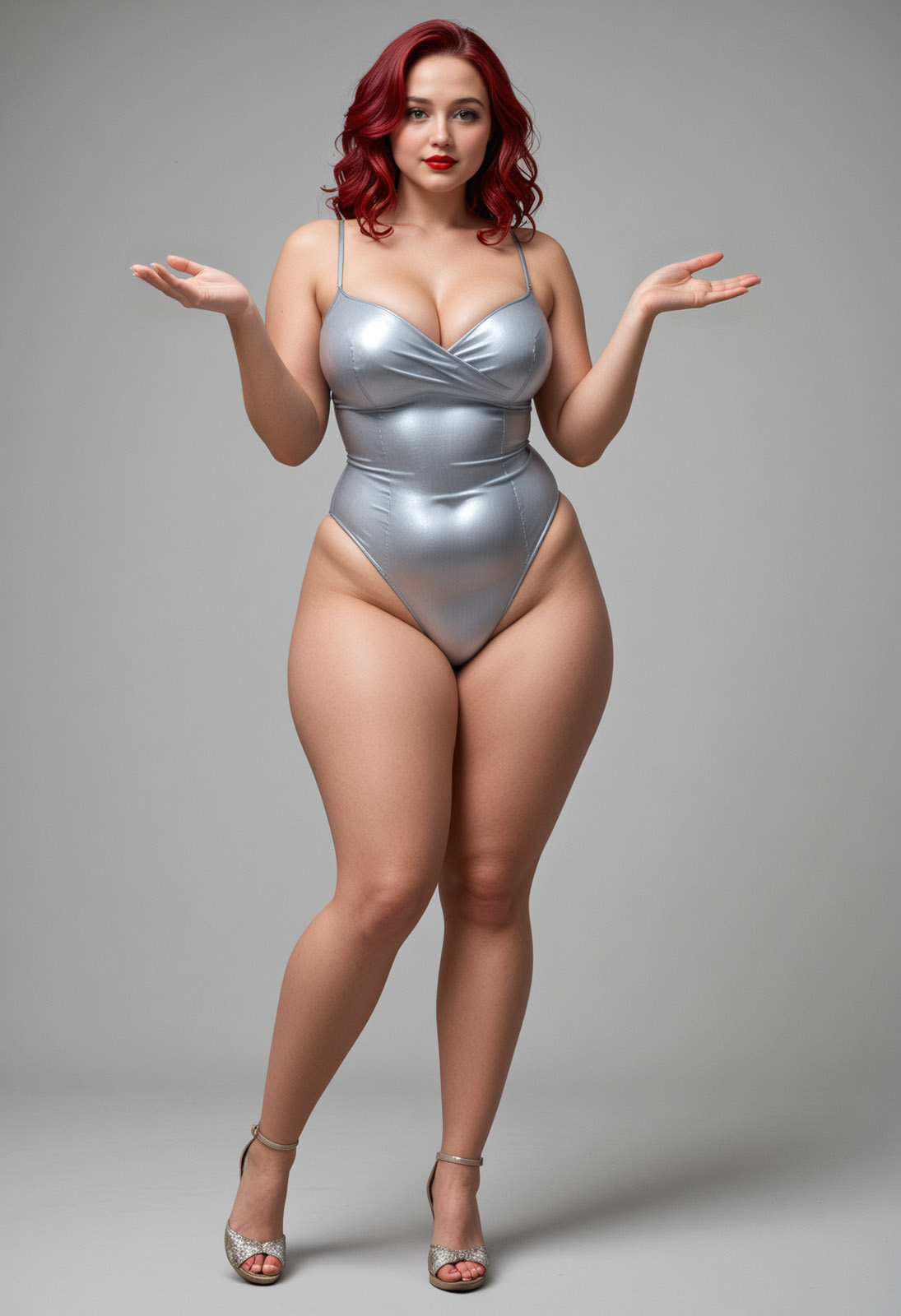 The image is a full-body portrait of a young woman with red hair. She is standing with her arms stretched out to the sides and her body slightly turned to the side. The woman is wearing a shiny silver one-piece swimsuit with thin straps and a plunging neckline. She has a pair of strappy heels on her feet. The background is a plain grey color. The overall mood of the image is confident and sultry.